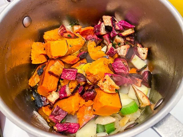 In a large pot, melt the butter along with 2 tablespoons of olive oil. When hot, add the chopped onions, celery, carrots, apple, and ginger. Stir all around with a pinch of salt and when everything is softened and fragrant, add the squash. Stir all around until the squash is thoroughly mixed in with everything else.