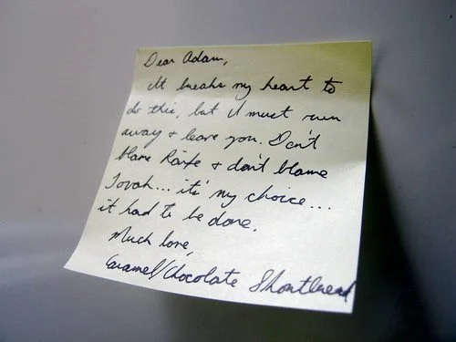 As mentioned in my Ferry Building post, the good people of La Cocina provided me with a package of Clare Squares (chocolate/caramel shortbread) to take back to New York. Strangely enough, though, as I packed up to leave Raife and Tohva’s apartment I found a note stuck to my computer:Suspiciously, there were crumbs and an empty plastic package near the computer, but “blame the hosts” is not an exercise in which I’ll take part.