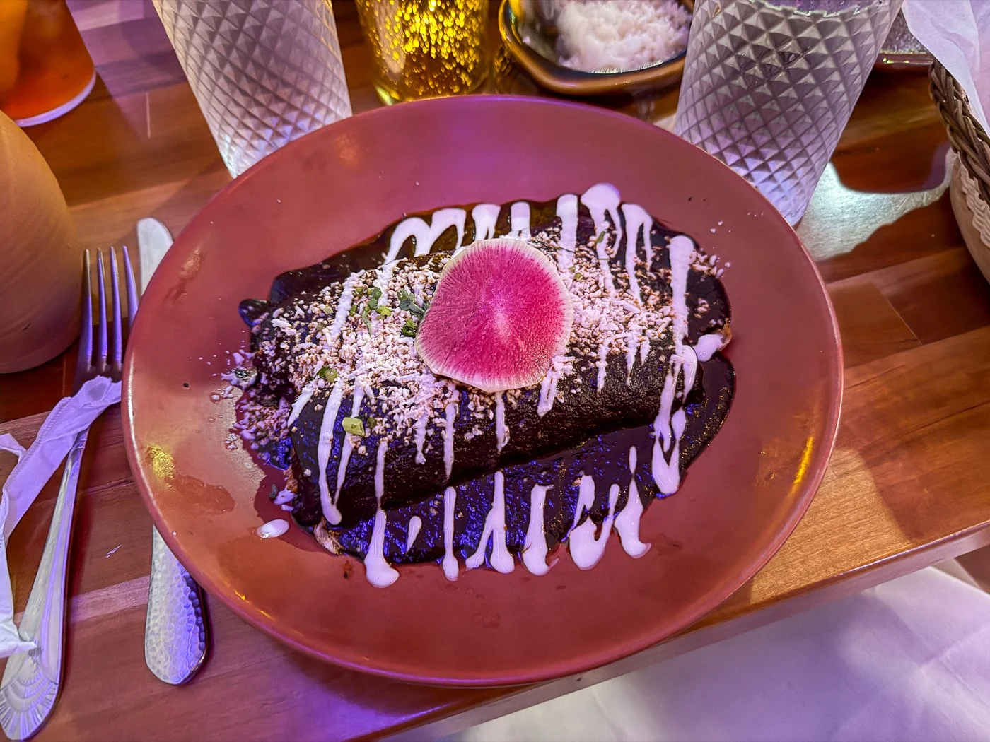 Here atop a classic chicken enchilada was that profoundly flavorful sauce made with chilies and chocolate and nuts and dried fruit and maybe thirty more ingredients. So many layers of flavor — heat, sweetness, toastiness — and, as they say, you could’ve poured it over a leather shoe and it would’ve been delicious.