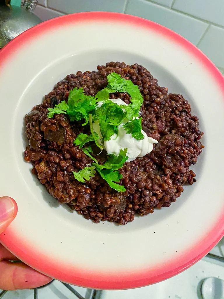Spicy Black Lentils with Charred Eggplant and Urfa Chili