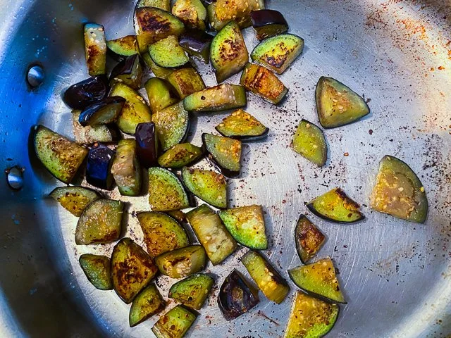 Start by heating a splash of olive oil in a wide, metal skillet. When hot, add one layer of eggplant: don’t crowd the pan (you may need to work in batches). Sear on all sides, then season with salt, and set aside. Do again until you’ve seared all the eggplant (you may need to add more oil as you go).