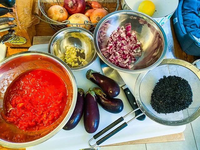 A few things: Ottolenghi’s original recipe calls for Puy (green) lentils. He also calls for cherry tomatoes that get charred along with the eggplant. I took liberties here based on what I had around. If you’re feeling unsafe, I get that; head over to Ottolenghi’s recipe, and make that.