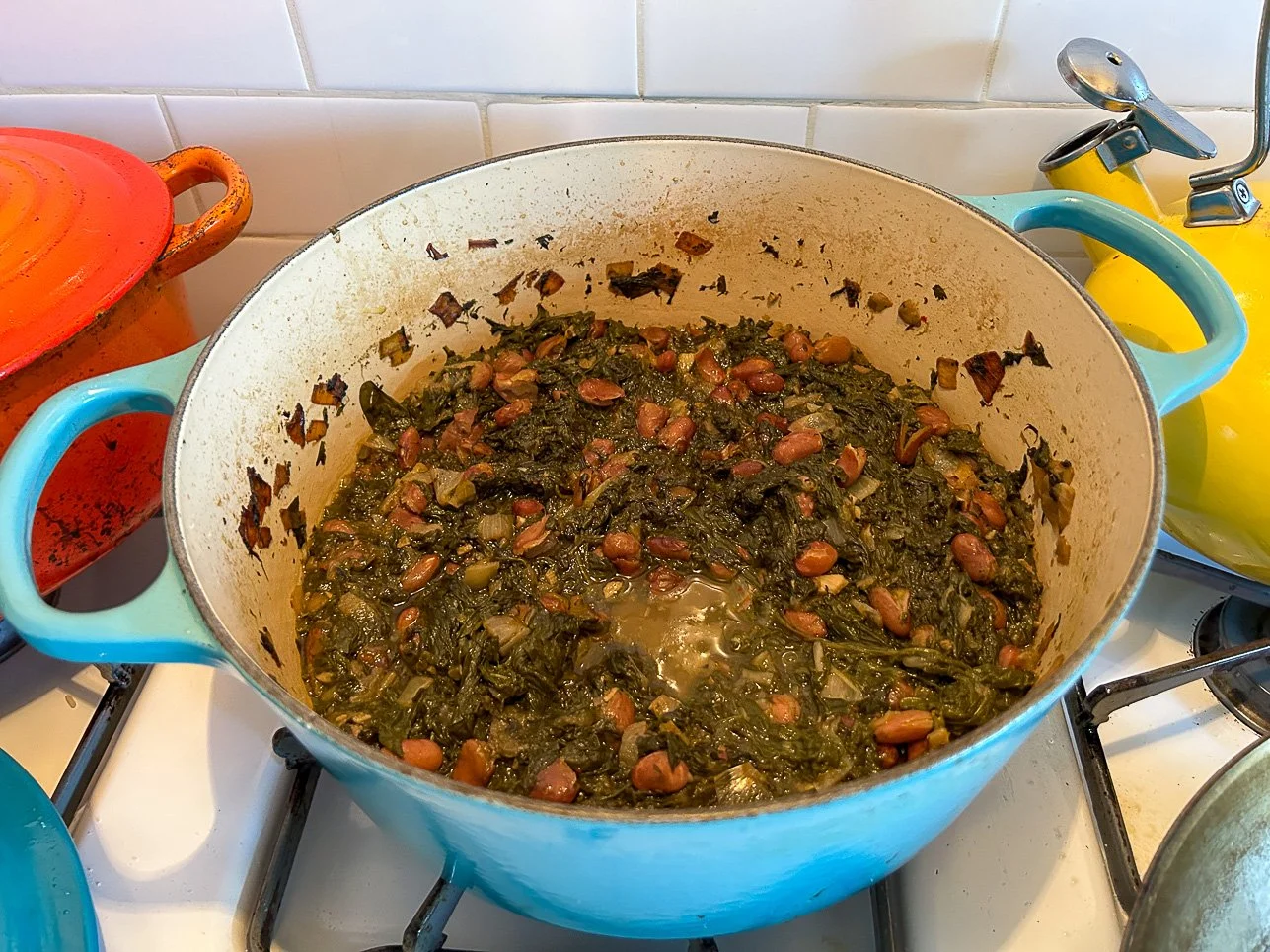 Two hours later you have something pretty extraordinary. All of those aromatics that you added after the spinach, instead of sautéing them first, infuse into the liquid which infuses into the spinach and the beans, creating a harmonious whole that’s greater than the sum of its parts. I checked things about halfway through the cooking and saw a lot of liquid in there, so for the remainder I braised with the lid a bit off so things would thicken up a bit.
