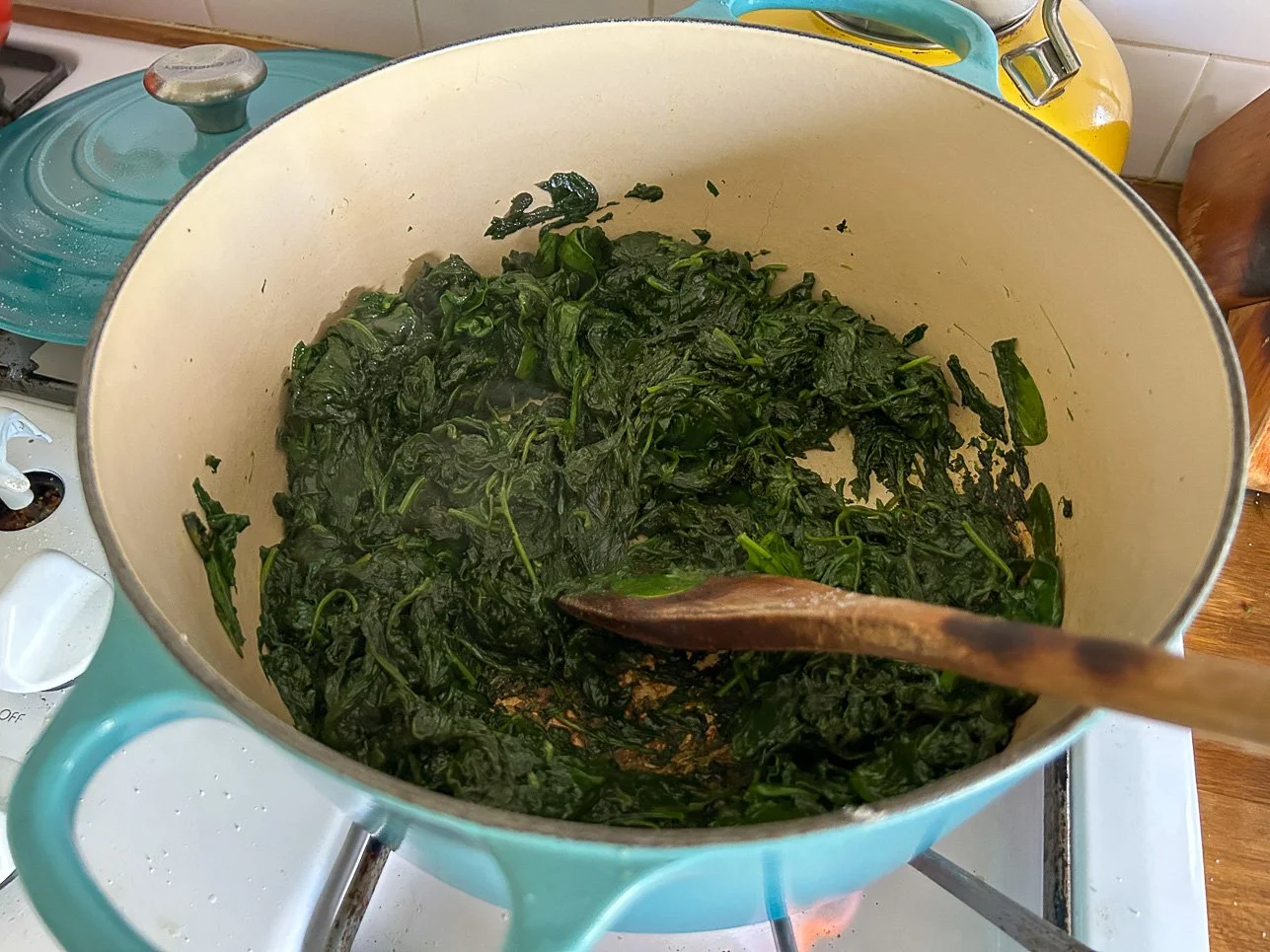 Heat 1/4 cup of the olive oil in a wide Dutch oven over high heat. Add the spinach, little by little (seasoning with salt every so often), and cook, stirring continuously, until all the spinach has wilted and browned slightly and all the liquid has evaporated, 20 to 30 minutes.