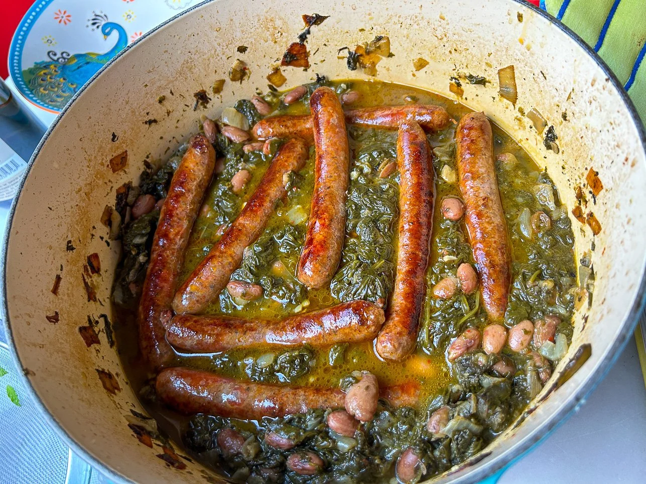 Every so often you encounter a recipe that grabs you by the throat and won’t let go. That was the case when I was thumbing through an old book in my collection: Daniel Boulud’s Braise, which he co-wrote with Melissa Clark back in 2013. This is one of those books that’ve survived many a cookbook cut because (a) braising is my favorite cooking technique (so much reward for such little effort); and (b) the recipes in it are fascinating. Like this recipe for Spicy Merguez with Spinach and Beans. It’s not that shocking to imagine lamb sausage, spinach, and beans together; but the technique is what left me shooketh.