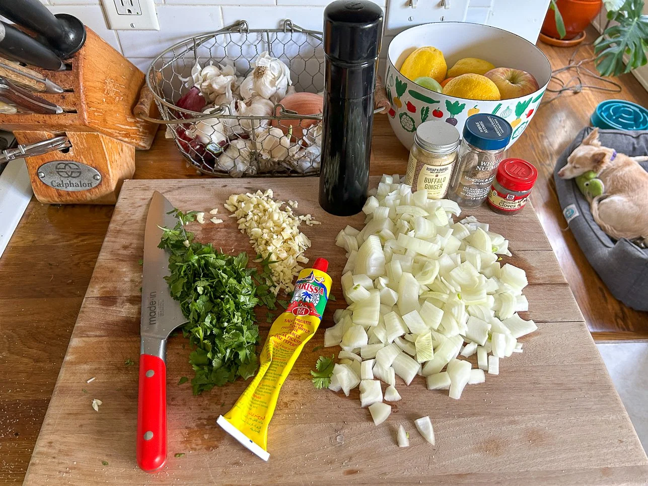 As you can see, Daniel Boulud has many tools in his arsenal to spice up your spinach. For starters: harissa. Then a ton of garlic, onions, cilantro, mint (I couldn’t find the mint I bought and by the time I did, it was too late), and Four-Spice powder which I mimicked using small spoonfuls of ground ginger, grated nutmeg, a pinch of cloves, and lots of black pepper.