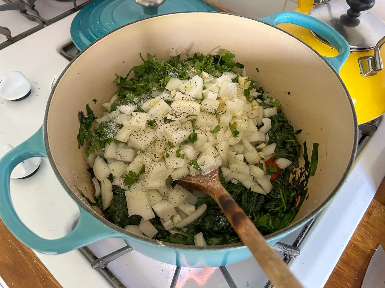 Again: that all goes in once the spinach is wilted. The recipe doesn’t say to, but I seasoned things as I went because I’m almost positive that’s what a four-star chef like Daniel Boulud does too. (Though maybe he doesn’t have you season because of the theory that salt inhibits the cookery of beans? But that’s been disproven.)
