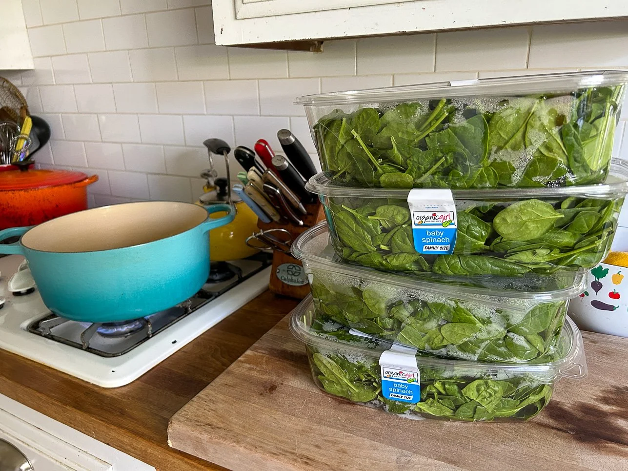 This recipe calls for four pounds of spinach. To put that into perspective, that image you see above? That’s two pounds of spinach. The idea of buying eight giant plastic containers of spinach was too much, even for me, so I decided to halve the greenery.