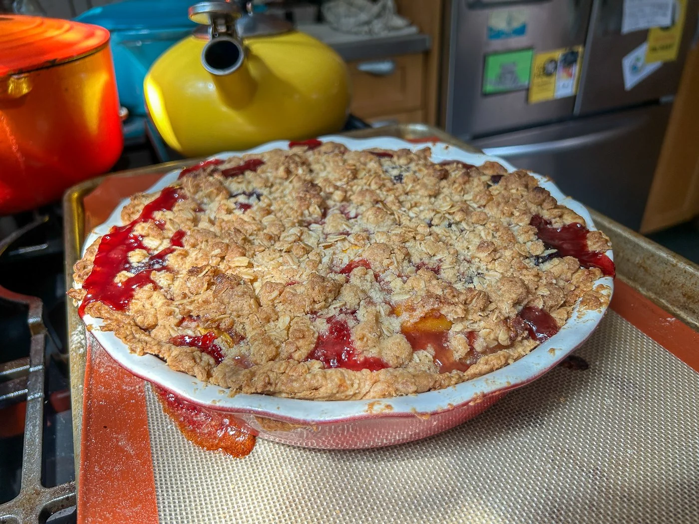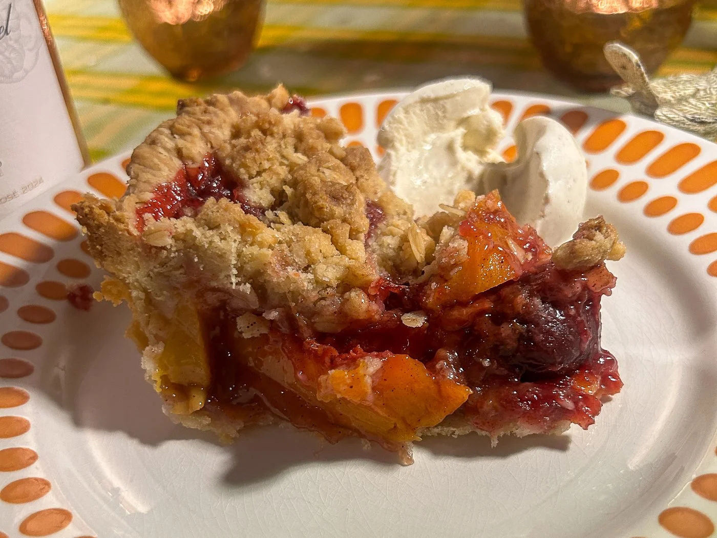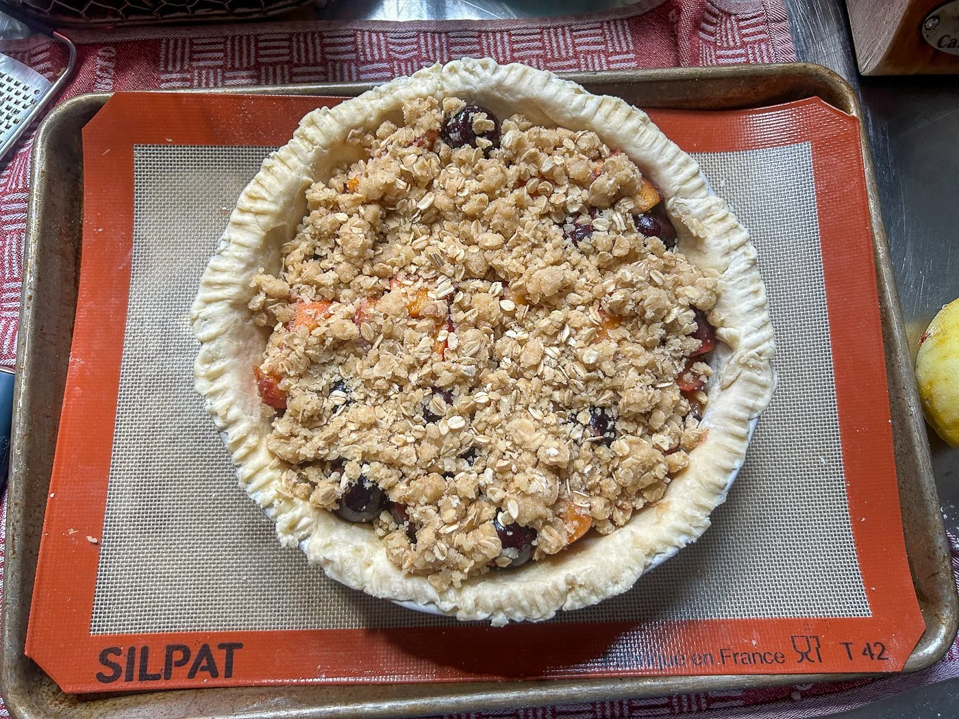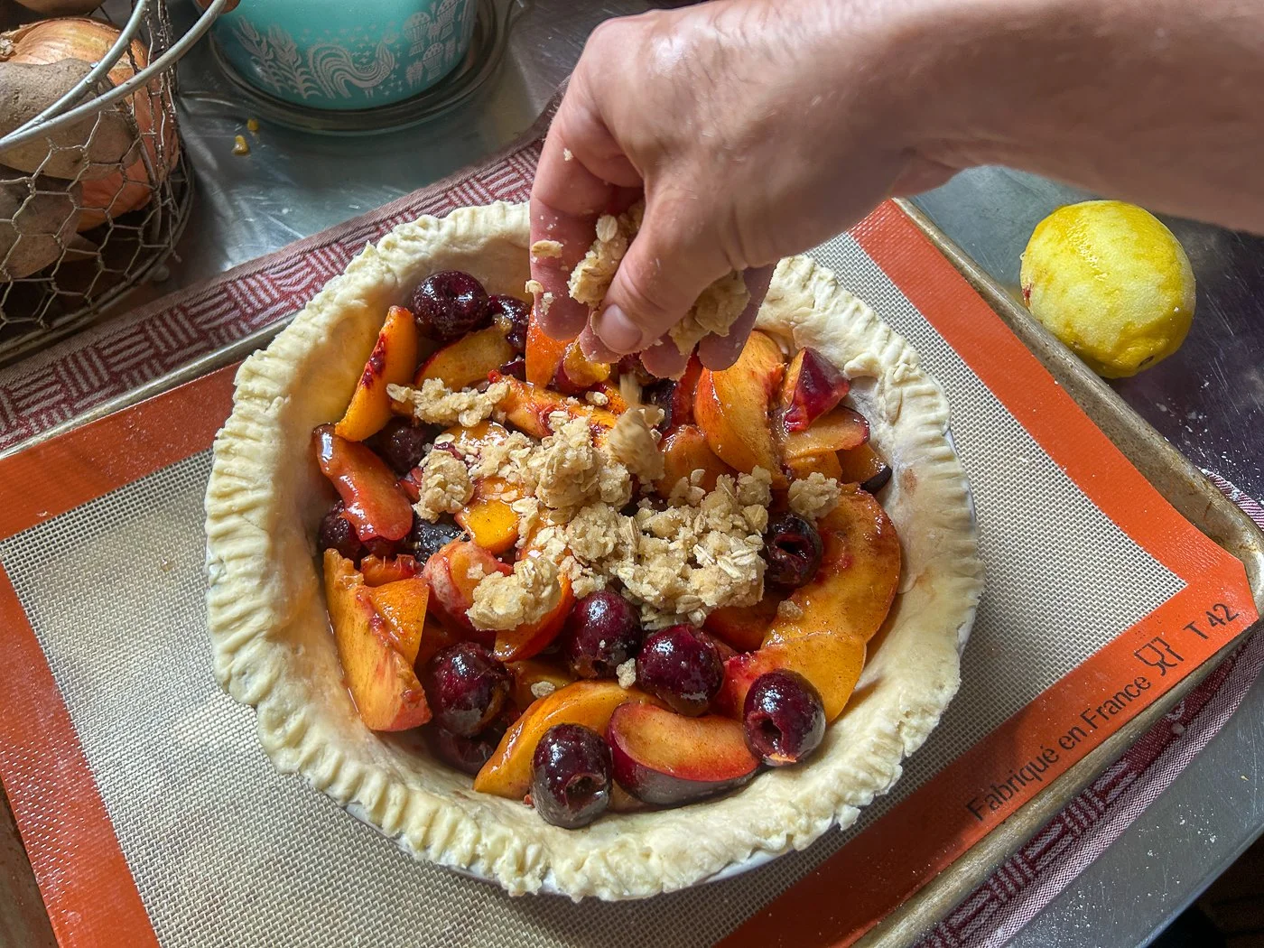 And that’s the secret about pie: even if you think you’ve really screwed it up, you haven’t, because when you bake any crust with lots of fruit inside — plus sugar and corn starch and whatever else you throw in for flavor (vanilla, Bourbon) — it’s going to smell and taste really good. And with this particular pie, Nicole Rucker’s Stone Fruit Party Pie from her extraordinary new cookbook Fat and Flour, you really really can’t screw up because the topping is a crumble.