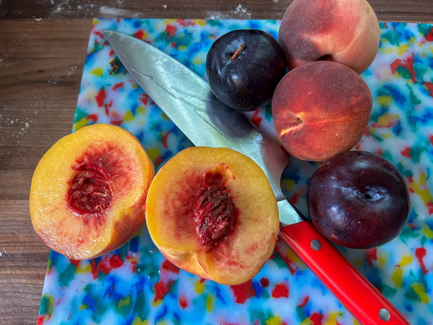 As far as the fruit goes, Nicole’s recipe calls for one-and-a-half pounds of stone fruit plus half a pound of cherries but after making it the first time, I added more fruit and didn’t change anything else. It still totally worked.