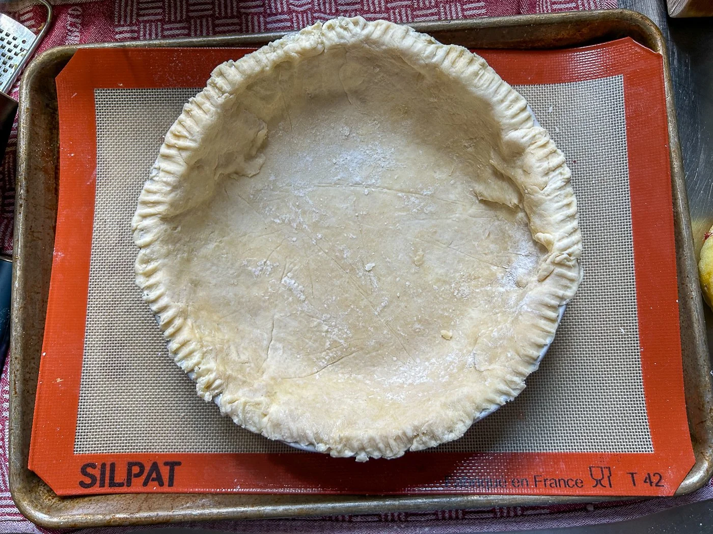 As much as I’ve written about pie on this here blog, I still make my share of mistakes. The pie crust in today’s post rolled out looking more like a map of America than a circle. When I lifted it into the tin I realized I didn’t have enough overhang to make a pretty crimp. No matter! I just pressed it down with a fork.