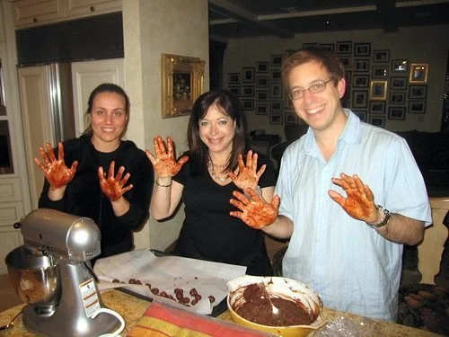 On the back burner you’ll see cream infusing with molasses, cloves, allspice, ginger, and cinnamon. That was later strained into the chocolate, mixed together and refrigerated. Then, hours later, we rolled that chocolate into little balls: that’s what you see my mom, Tali and I doing in the lead photo of this post.