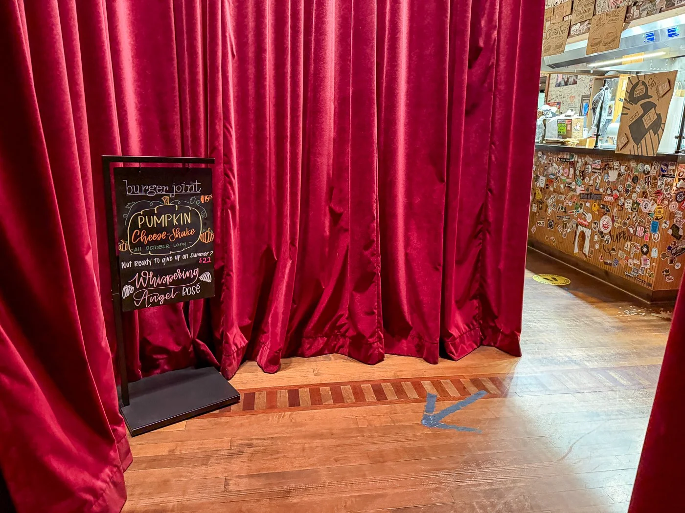 The Burger Joint is still behind a red velvet curtain (is that velvet? I need to hire a fact checker) but it’s changed hotels. You’ll now find it at The Thompson Hotel on W. 56th Street. This proved to be the perfect location for our night out last week when we went to see Bat Boy at City Center. It was literally across the street.