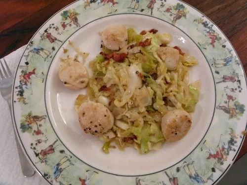 But all wasn’t lost. I “tweaked” the recipe so instead of serving them with whatever it is Thomas Keller wants you to serve them with, I served them on a bed of cabbage cooked with bacon and wine (a recipe I learned from Rebecca Charles when we made our fish musical. Recipe here.)