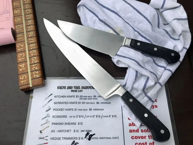 Look, I’m just like you, I don’t get my knives sharpened that often. But this past weekend I went to the Atwater Village Farmer’s Market, where there’s a knife sharpener, and I brought my two main knives with me.