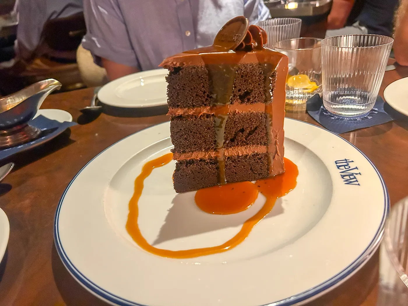 I had a grilled swordfish for my entree — very good — and then we all shared this chocolate cake with caramel sauce.