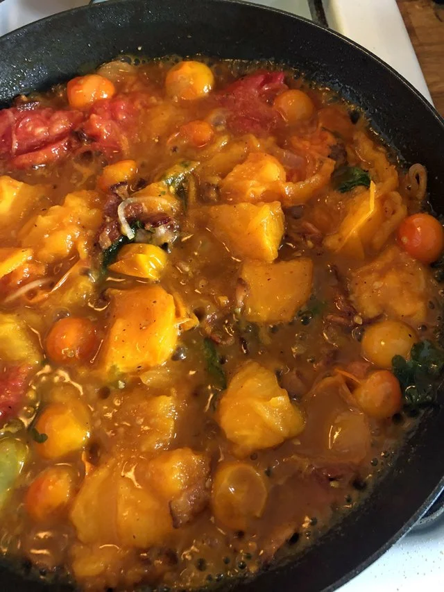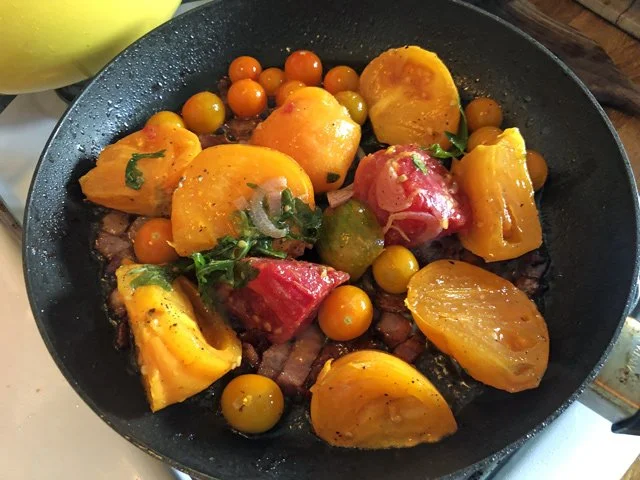 I cranked up the heat and when the bacon had rendered a bunch of fat and gotten pretty crispy, I poured off half the fat and then added the leftover tomato salad directly to the pan, along with some sungolds and a pinch of salt.