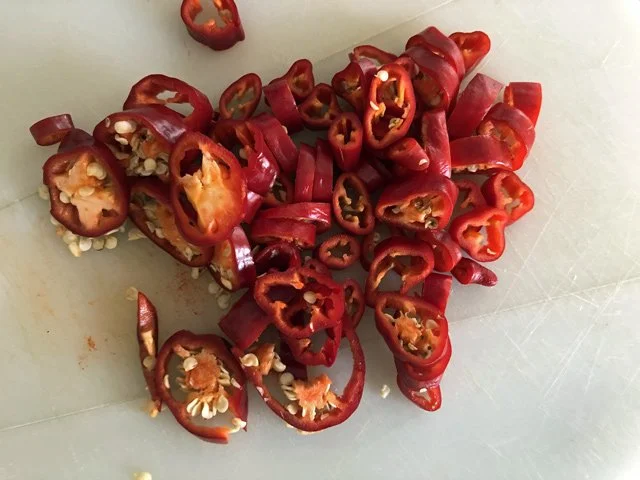When I got home, I decided to quick pickle them: I just sliced them into rings, poured a cup of apple cider vinegar into a pot, added 1/4 cup sugar, a big pinch of salt, a bunch of peppercorns and brought everything to a boil. Then I added the sliced peppers (seeds and all)…