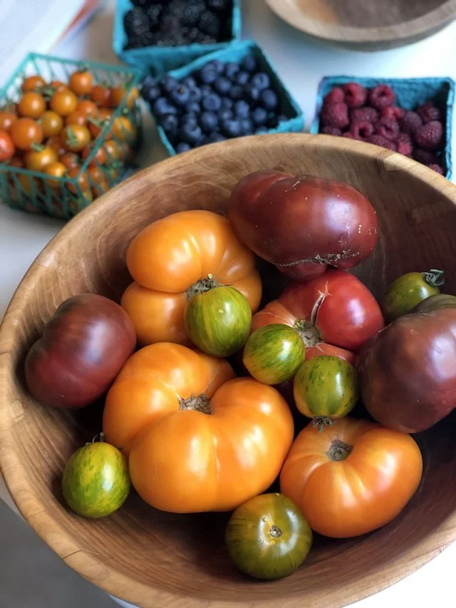 First: the tomato salad. I bought a bunch of heirlooms at Cookbook and just sitting there in a bowl on my kitchen table, they looked like a finished dish: