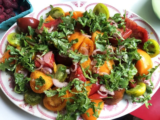 I lifted them out on to a platter, then to the leftover dressing in the bowl, I added a sliced shallot, swished it around, then layered it on top of the tomatoes. Finally, I did the same with some arugula. Behold my tomato salad: