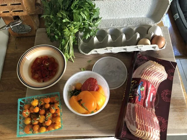 The next morning, I took it back out, along with some bacon, eggs, sungolds, the pickled Nardello pepper rings, and parsley.