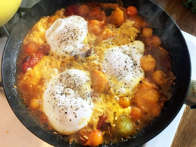 When a lot of the liquid evaporated, but before the tomatoes completely broke down into a sludge, I cracked three eggs directly into the pan, sprinkled them with salt and pepper, and covered the pan, lowering the heat to medium.