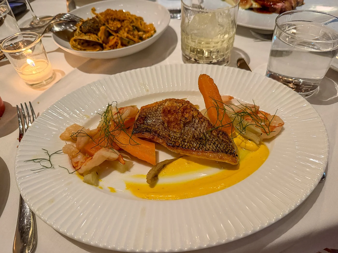 For my entree I had the “Black Sea Bass with Ruby Red Shrimp, Vegetables Provençal, and Saffron Aioli”: