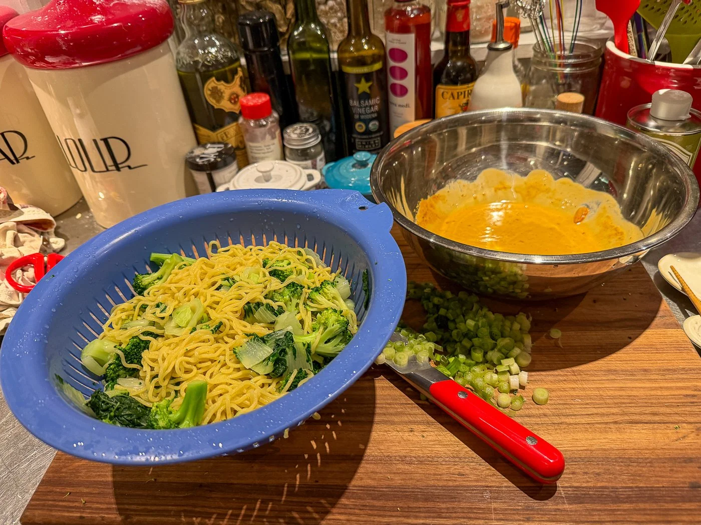 Then you bring a pot of water to a boil, season with salt, drop in some fresh ramen noodles (I bought mine at Ten Ichi Mart), drop in the vegetables, and when everything is cooked (just a few minutes), you drain and rinse with cold water.