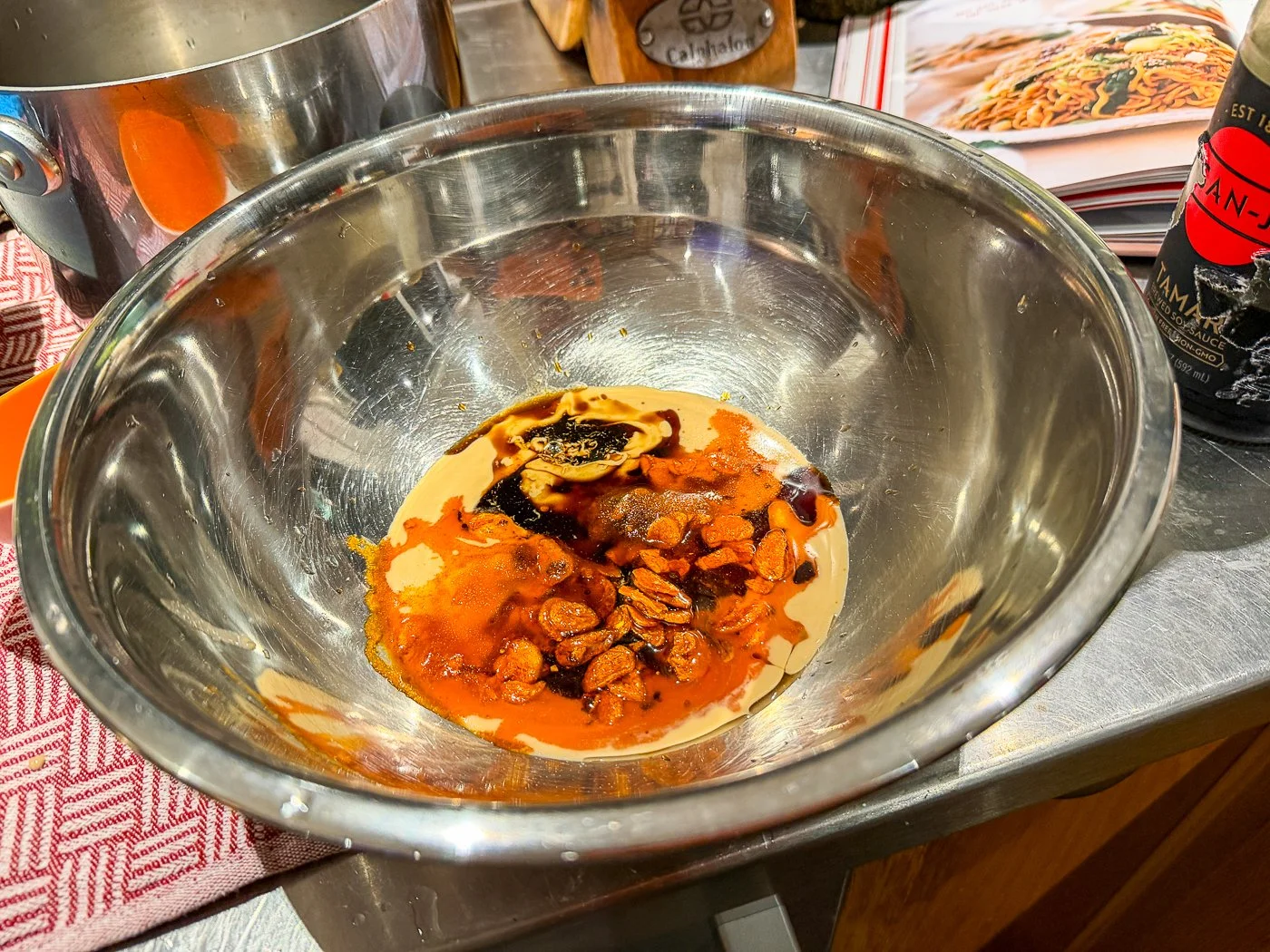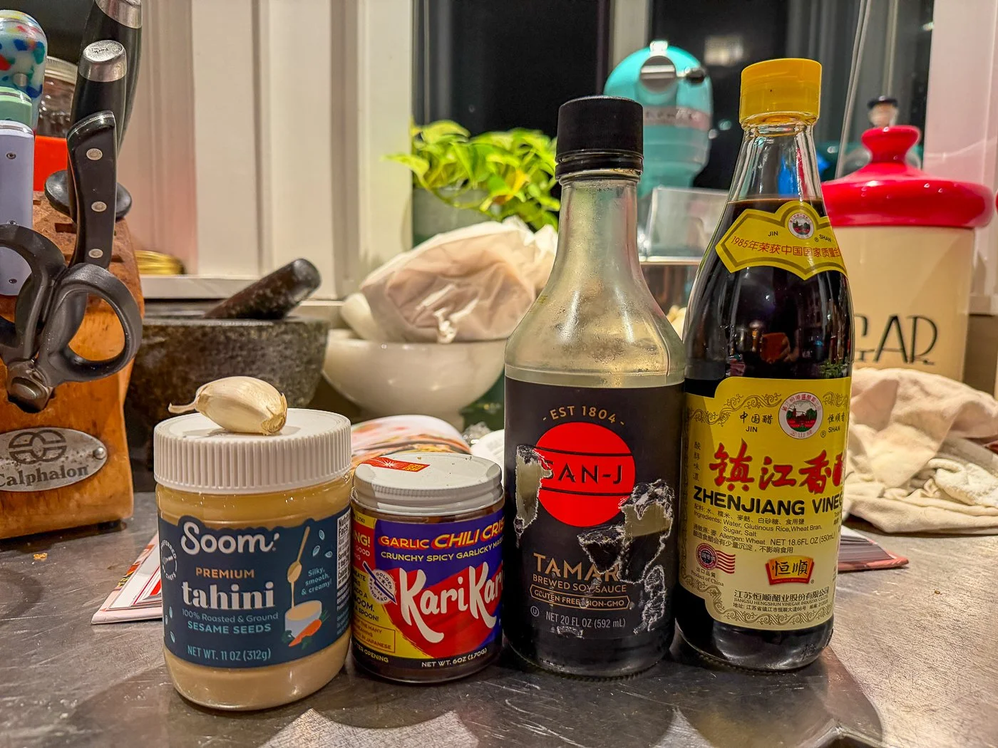 That’s sesame paste (you can use tahini or Chinese sesame paste), chile oil/crisp (mine had garlic in it), soy sauce or tamari, and black or rice vinegar. Mix those together with a little sugar and some nondairy milk to thin out a little, and you have an unbelievably flavorful sauce that’s spicy, nutty, sharp, and smooth.