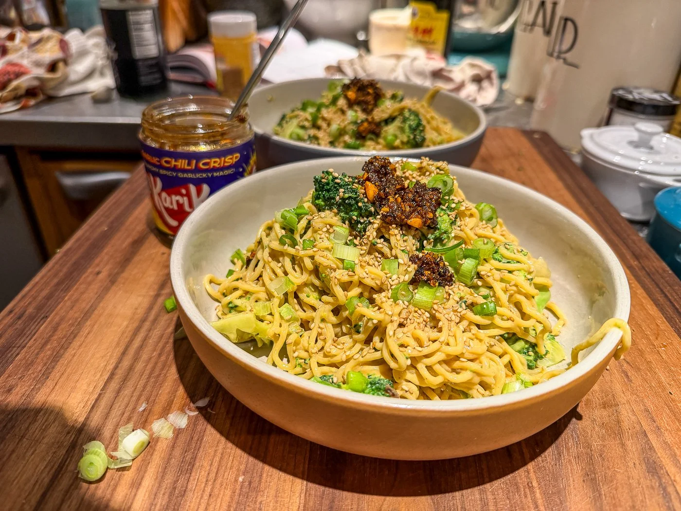 - In a large shallow bowl, place the ramen noodles, greens, and corn (or broccoli). Add the dressing and toss to coat. Top with the sesame seeds, scallions and a few drops of chile oil or crisp. Taste and season with salt if needed. Serve at room temperature.