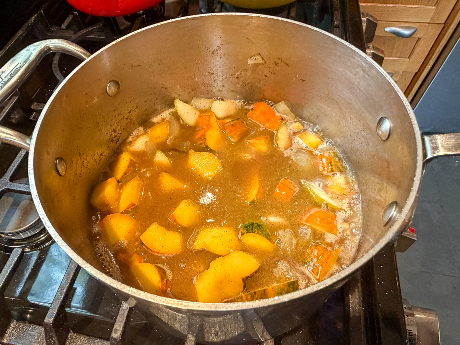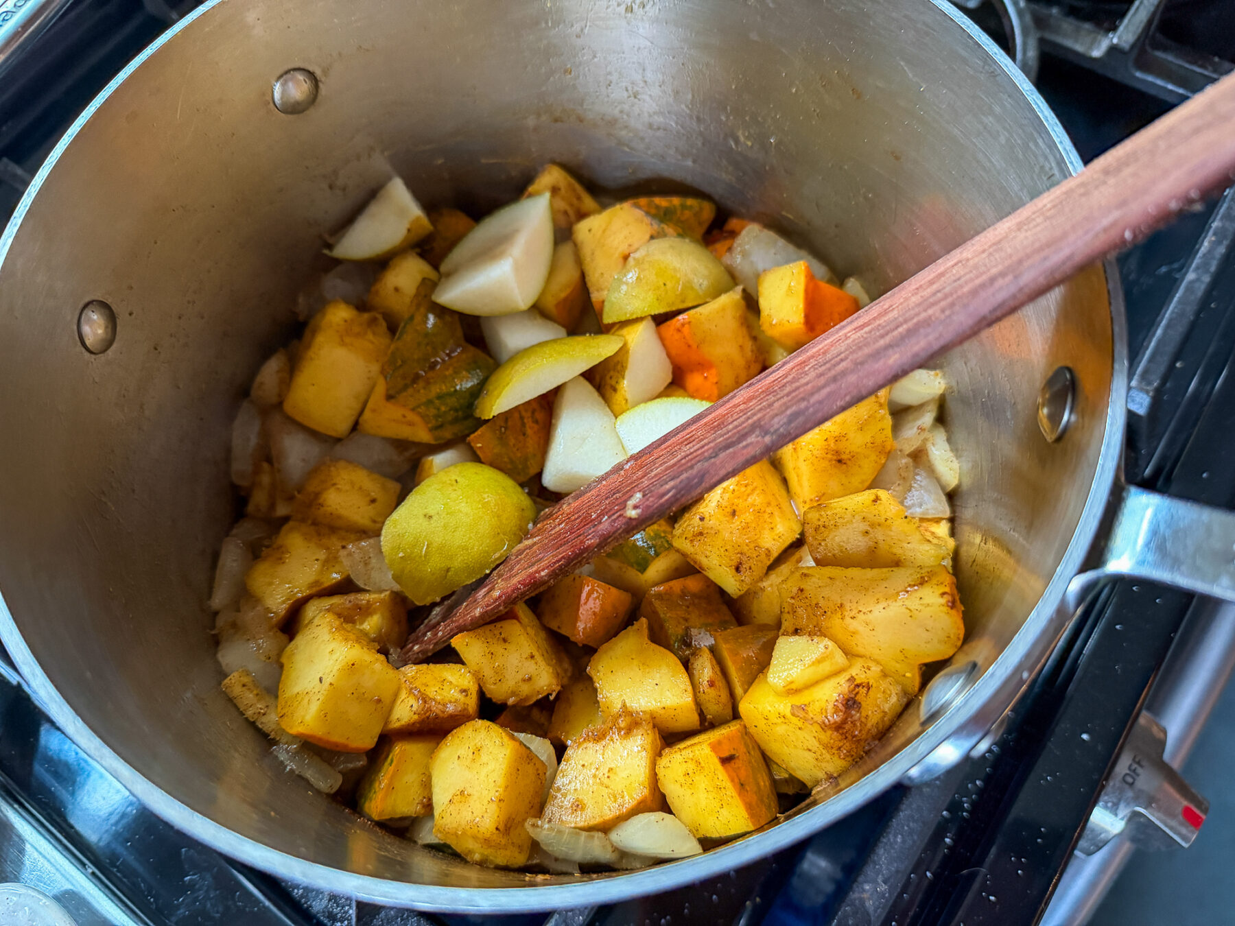 The more liquid you add, the thinner your soup will be. So I try to just cover the vegetables/apples/pears and let it simmer for about 20 minutes until you can smash everything with a wooden spoon against the side of the pot.