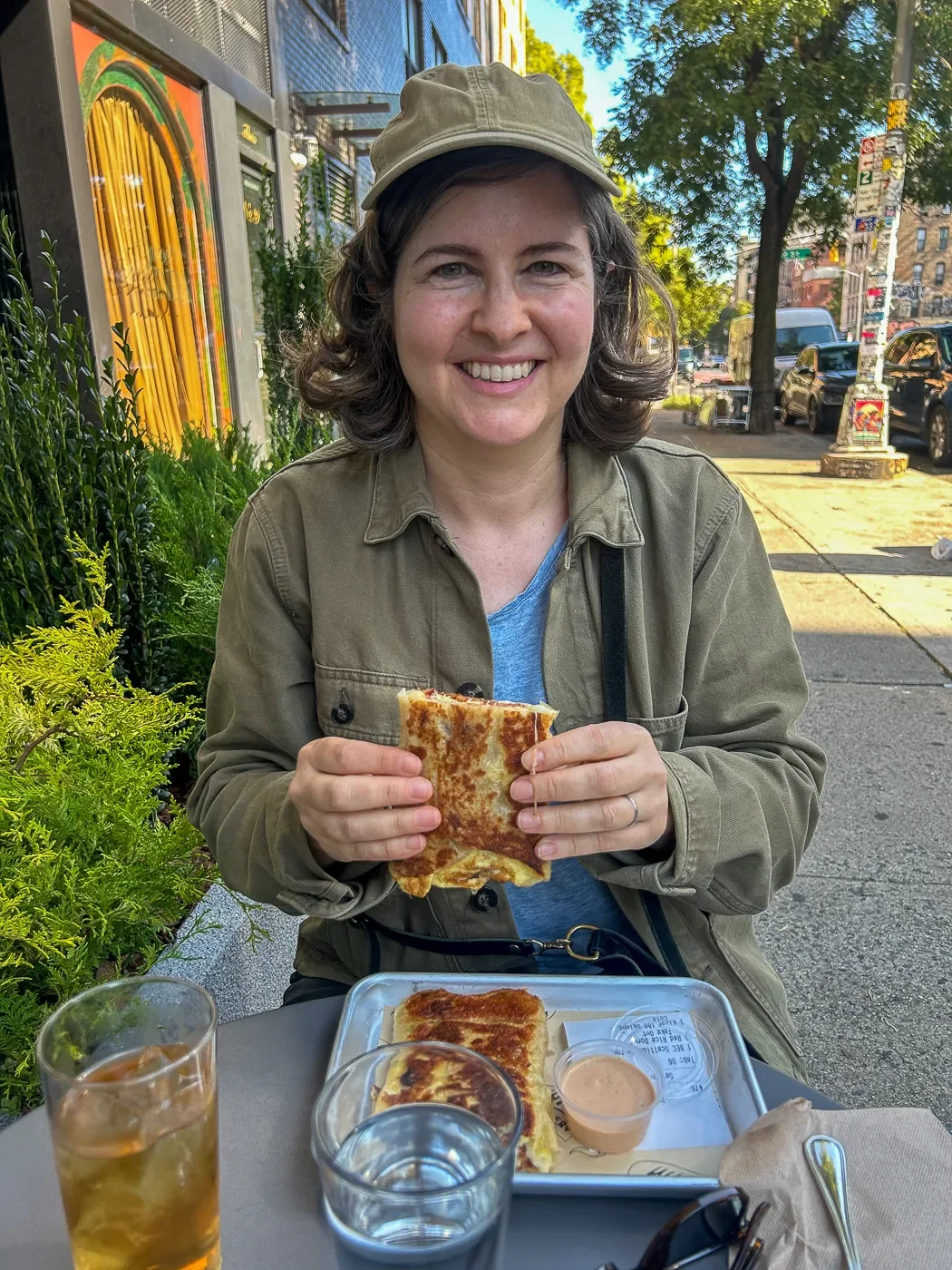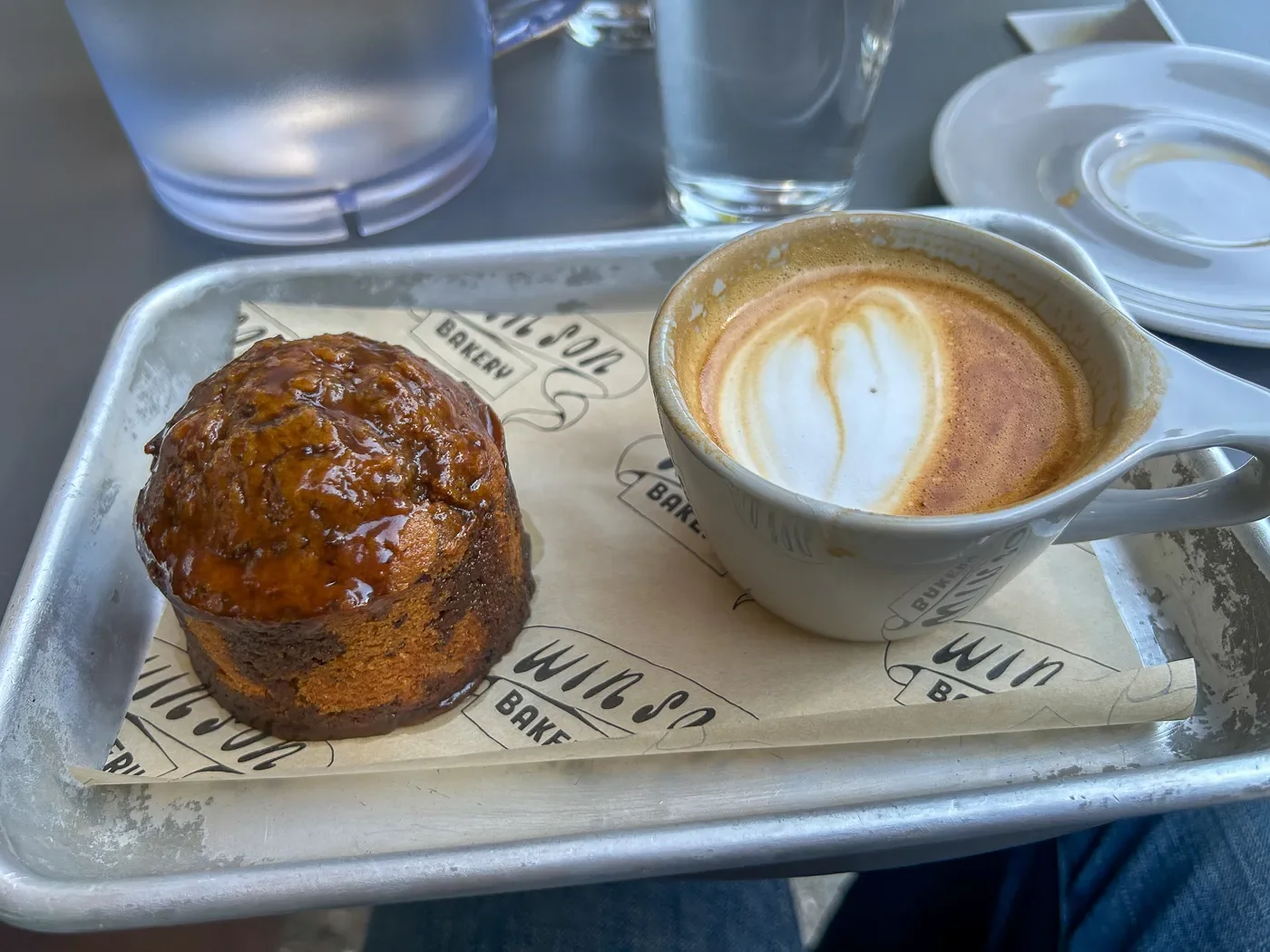 She had the scallion pancake bacon egg and cheese — I named it my #1 restaurant dish of 2023 — but I’m trying to be good about exercising, and that’s a bit of a gut bomb, so I opted for the red date cake and a cappuccino, both of which were lovely (see lead image).